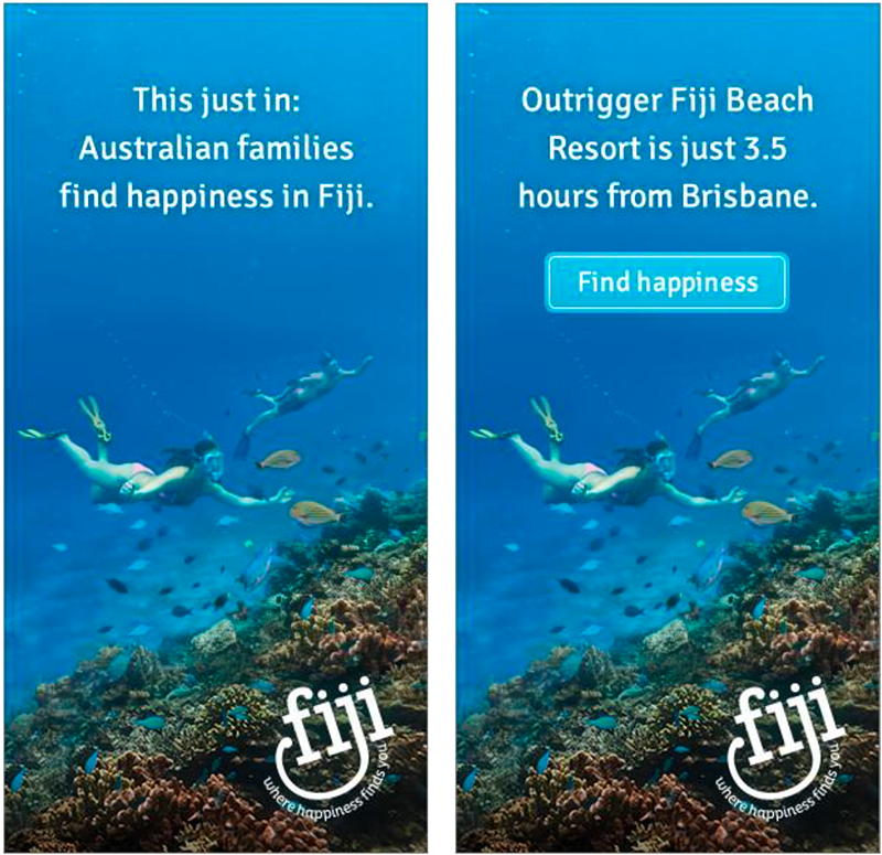 We saw an opportunity to reinvigorate Tourism Fiji’s brand positioning - ‘Find happiness’ - by using data to expand its resonance with more audiences. We identified three key markets - couples, families and adventure-seekers - and served over one thousand dynamic display ads targeted by demographic and affinity. We also created three homepages of the Tourism Fiji website, to ensure the consistency of each user’s journey. The campaign was supported by 30+ contextual out-of-home placements and a DR social drive that encouraged click-through to Fiji Airways’ booking centre.