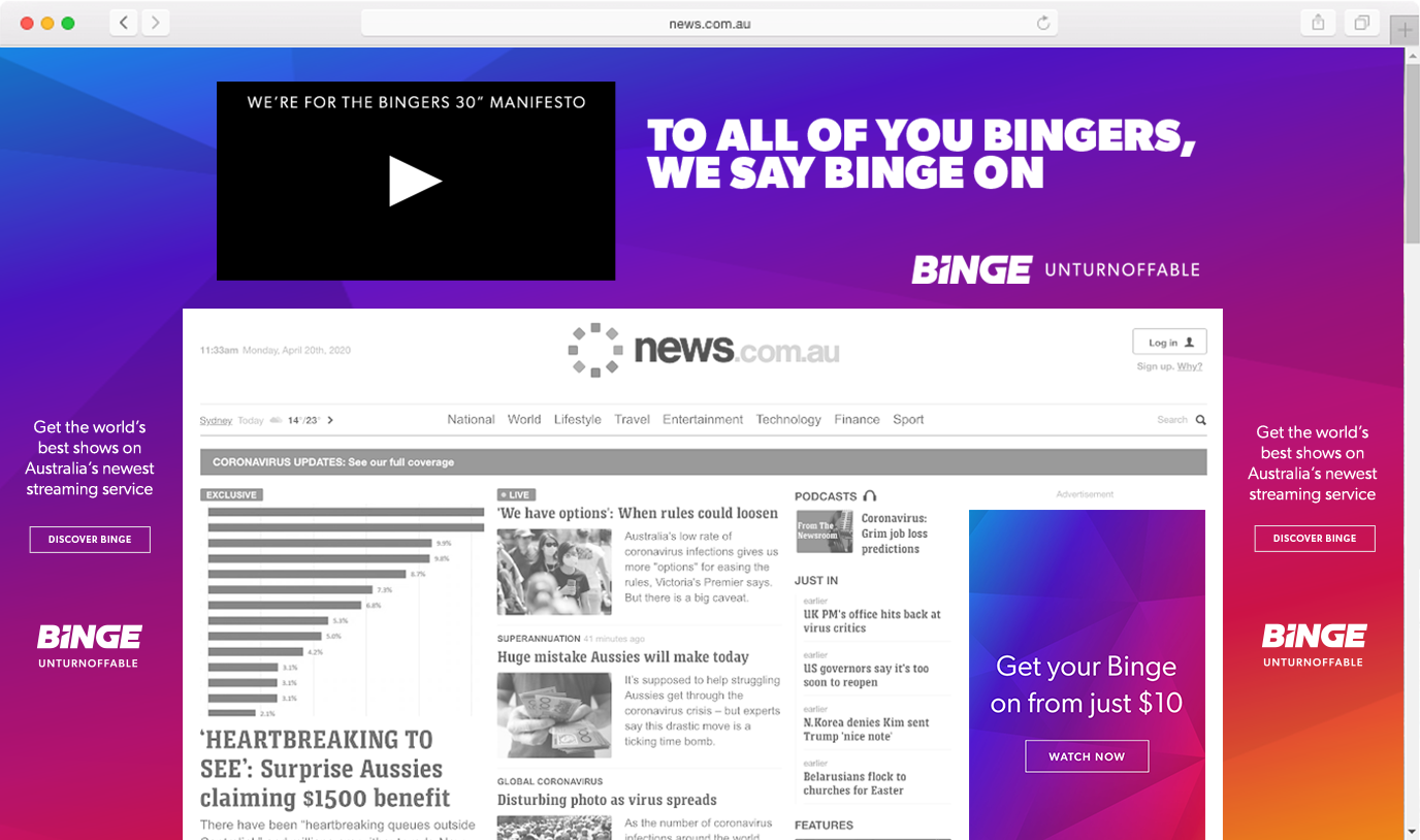 After a successful pitch, we helped bring a new streaming platform, Binge, to the Australian market. With launch comms across TV, print, radio, out-of-home and display we asked Australians to ‘Get your Binge on’.
