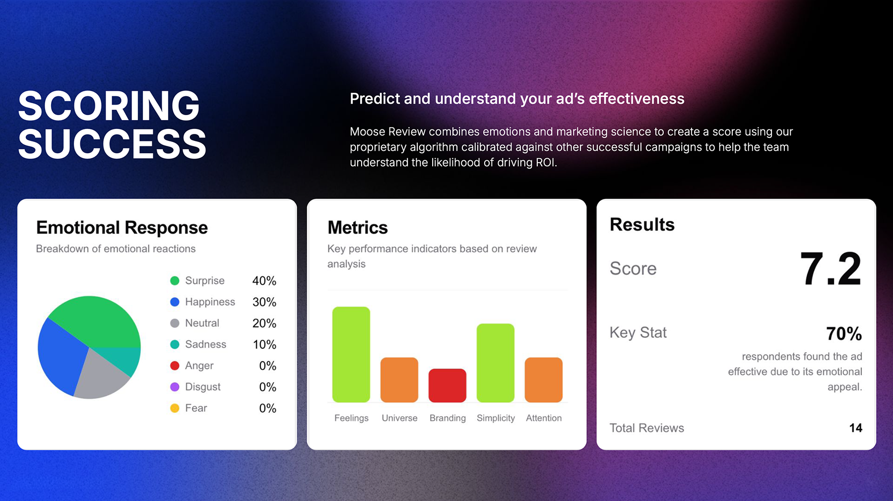 Moose Review started as a testing tool whereby people could watch an ad and score it based on their own personal thoughts against 5 pillars of marketing science. A score was then generated and we could evaluate an ad based on our thoughts and feelings about what we’d just watched. But we found ourselves to be biased and wanted a more balanced view. That’s where AI came in. We built out scores of AI synthetic human personas and bucketed them into audiences which allowed us to get much more accurate about what the target audience is likely to think about a piece of work. We then bolstered the tool with a creative ladder which gave a tag to each piece of work alongside the score to help make sense of the results.