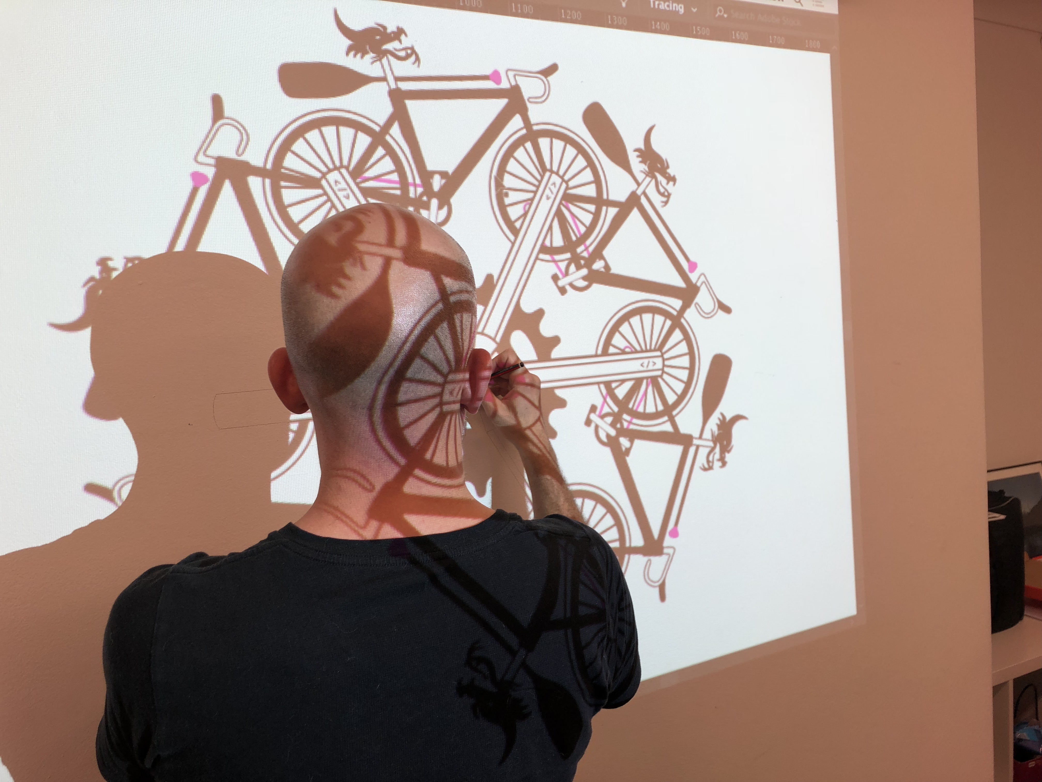 I started with a pencil sketch and then turned it into a vector artwork in Illustrator. I then projected the art onto the wall and pencilled it out. I then used permanent ink to paint the wall and get the nice crisp sharp lines I was looking for.