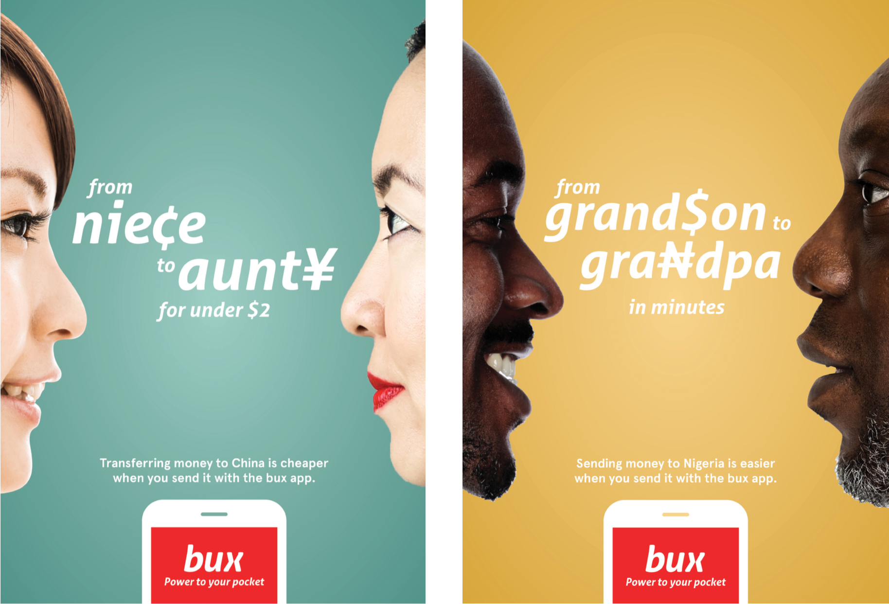 Bux was an international money transfer platform that made it easier, safer and cheaper to send money to the people you love overseas. We were briefed to brand the platform and launch its new positioning with a nation-wide campaign. Bux caters to many different transfer corridors each with their own unique culture and currency so we created a campaign that reflected this diversity. And so our platform ‘Power to your pocket’ was conceived.