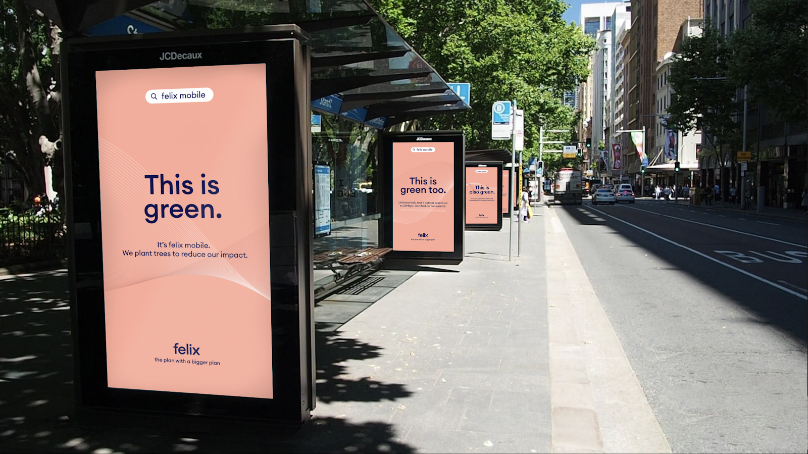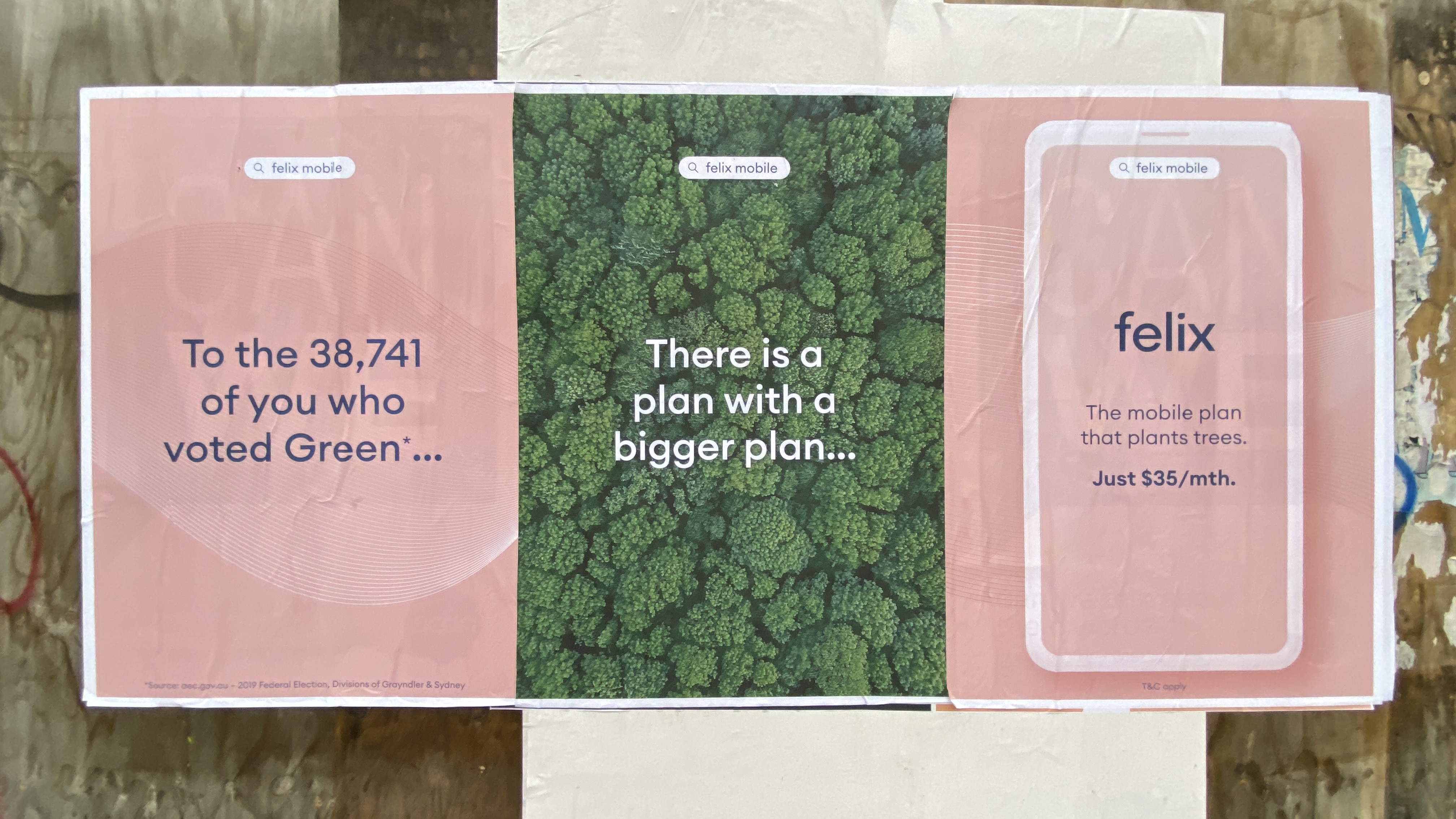To make audiences think twice about what being green really means, we employed a “prediction error” that championed the brand’s eco creds and increased recognition of their peachy brand colour. A prediction error signals a deviation from the brain’s current state, based on the viewer’s model of the world, e.g. stating something is green when it is clearly peach-coloured. This deviation calls for an “update” and the viewer is encouraged to resolve this by looking for more information a second time. Now that we had our audience’s brains in a behaviourally scientific vice grip, we wanted to share that unique feeling when a brand aligns with our audience’s personal values. We coupled the prediction error of the “This is green.” headline with felix’s tree-planting commitment, delivering a peachy solution to the prediction error. To add sweetness to our media plan, we created a triptych of street posters that leveraged Federal Election data to attract the attention of Greens voters in key metro areas, letting them know that there is a mobile plan that shares their values.