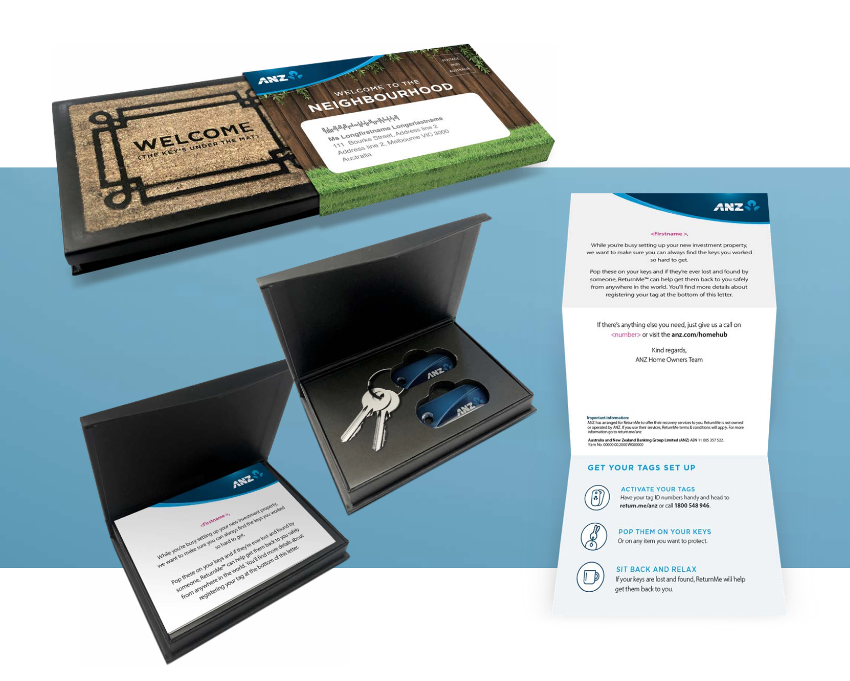 The arrival of Open Banking meant switching home loans was about to become much easier which presented a new challenge for ANZ. They needed to shift their customers’ relationship from broker to banker, and break the traditional ‘30 year silence’ which left customers feeling unloved. We wanted new home loan customers to feel recognised by the bank and part of a community. So, we created a DM gift pack that looked like a welcome mat to your new home. Inside was a welcome letter and a set of key tags that you can never lose.